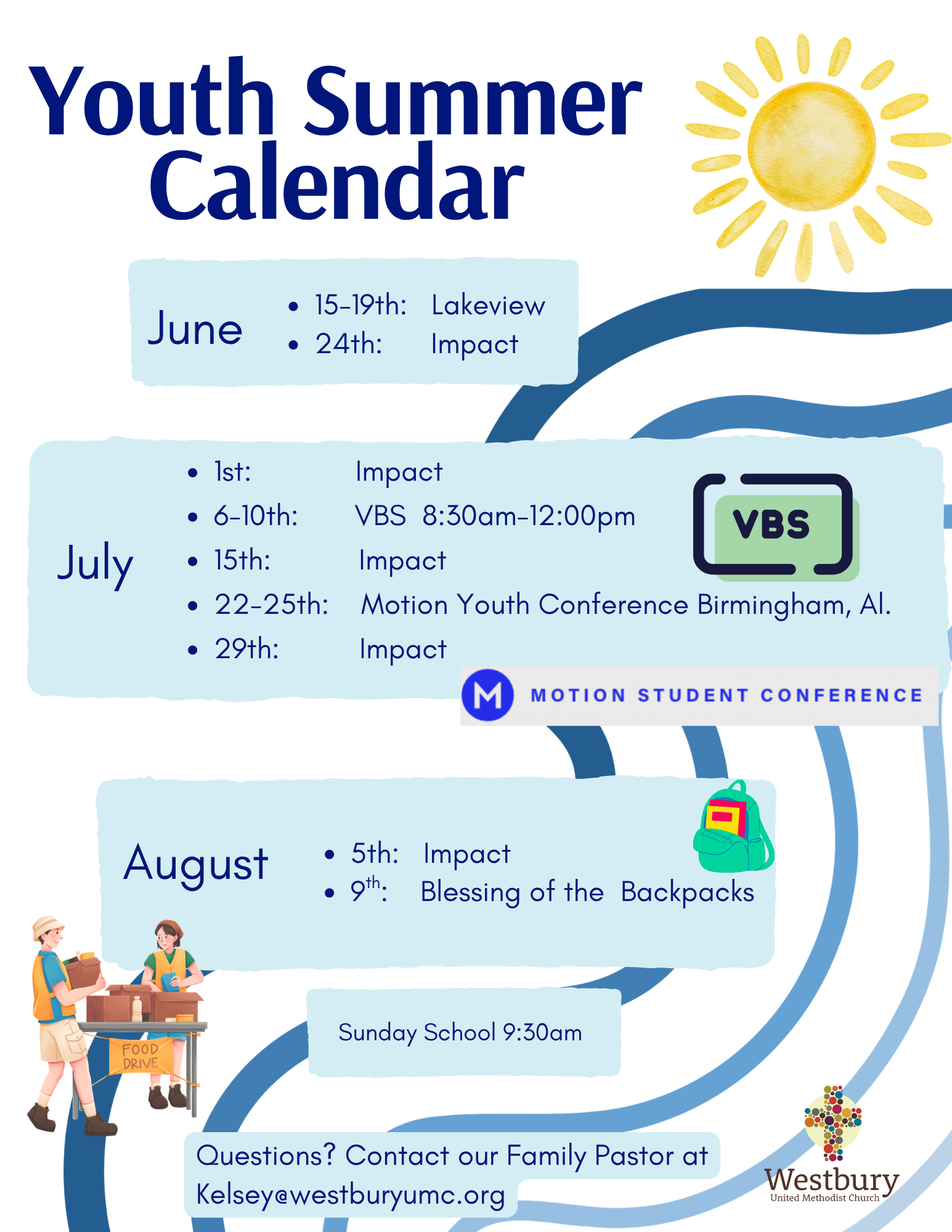 Email our Family Ministries Pastor, Rev. Kelsey Richardson at Kelsey@westburyumc.org