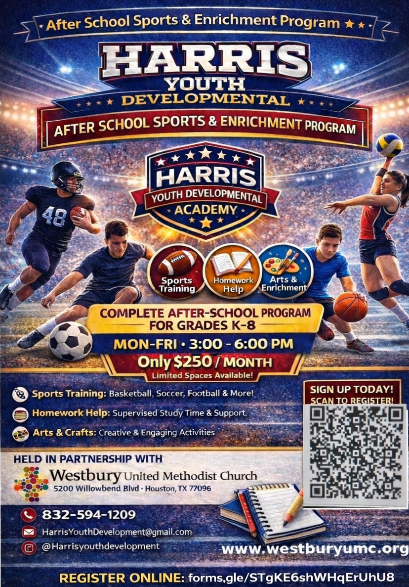 Harris Youth Development offers after-school and sports training programs for children in partnership with Westbury United Methodist Church. The goal is to give kids a safe, structured place to grow physically, academically, and creatively.
