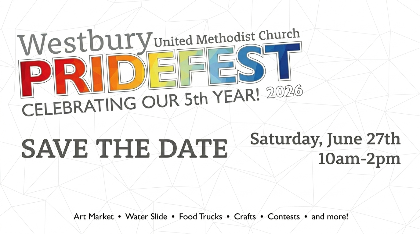 Westbury United Methodist Church invites you to our celebration of LGBTQ+ community at our PrideFest held Saturday, June 27th, from 10:00 AM to 1:00 PM. We believe that each of us is a beloved child of God and perfectly made in God's image. We look forward to celebrating with you!