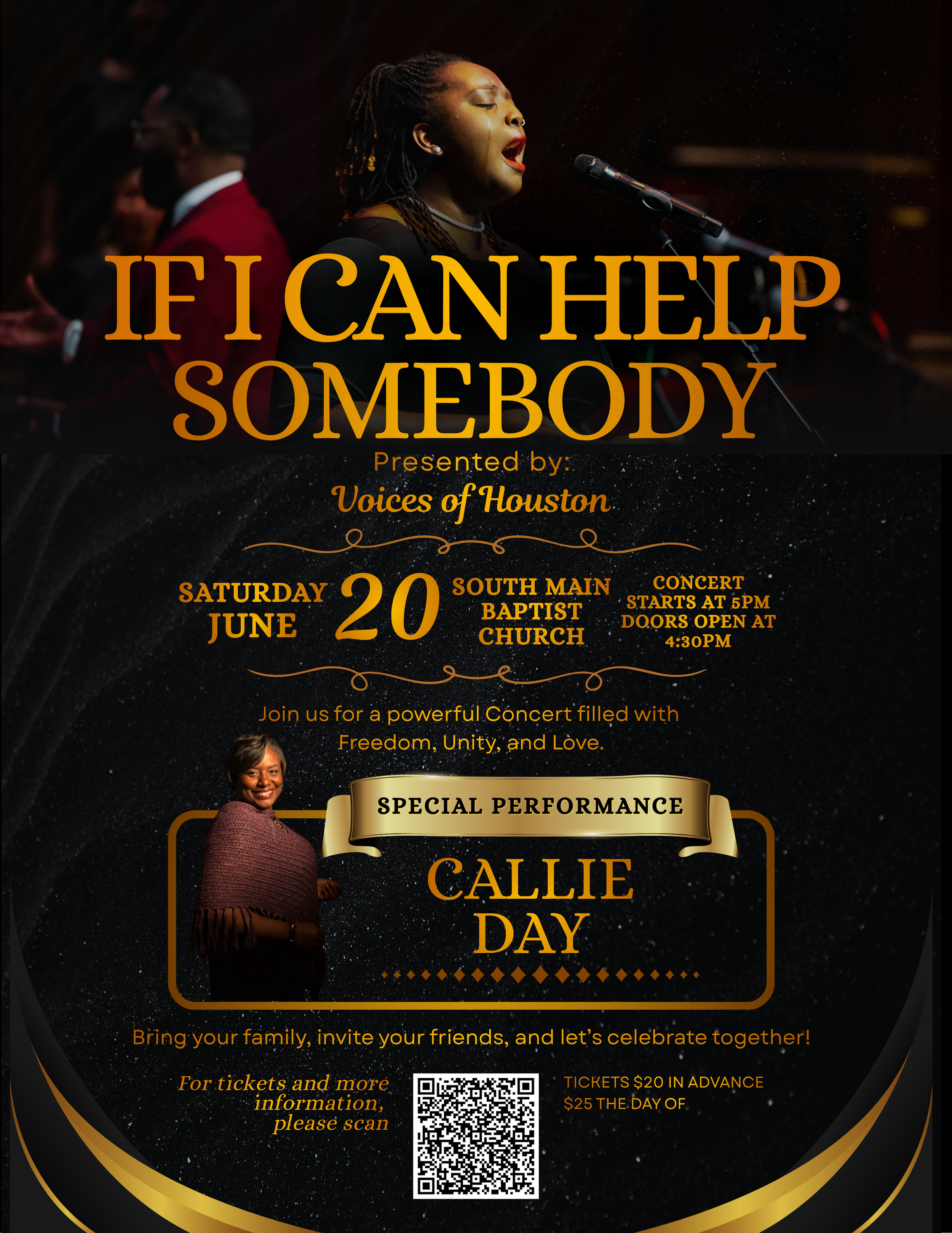 Voices of Houston is proud to present our upcoming Juneteenth concert, “If I Can Help Somebody,” featuring acclaimed gospel artist Callie Day. This special event honors the rich cultural and spiritual legacy of Juneteenth through uplifting choral and gospel music that reflects themes of freedom, faith, and unity.
